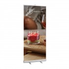 Rollup mit folgenden Spezifikationen: Inkl. Druckmotiv, dieser ist nicht austauschbar; Format: 85 x 200 cm; Brandschutz: B1 zertifiziert; Gute Qualität, mit 2 Stabilisierungsfüßen zum Ausdrehen; Klemmprofil oben mit sichtbarer Kunststoffaufhängung; inkl. gepolsterte Nylontragetasche